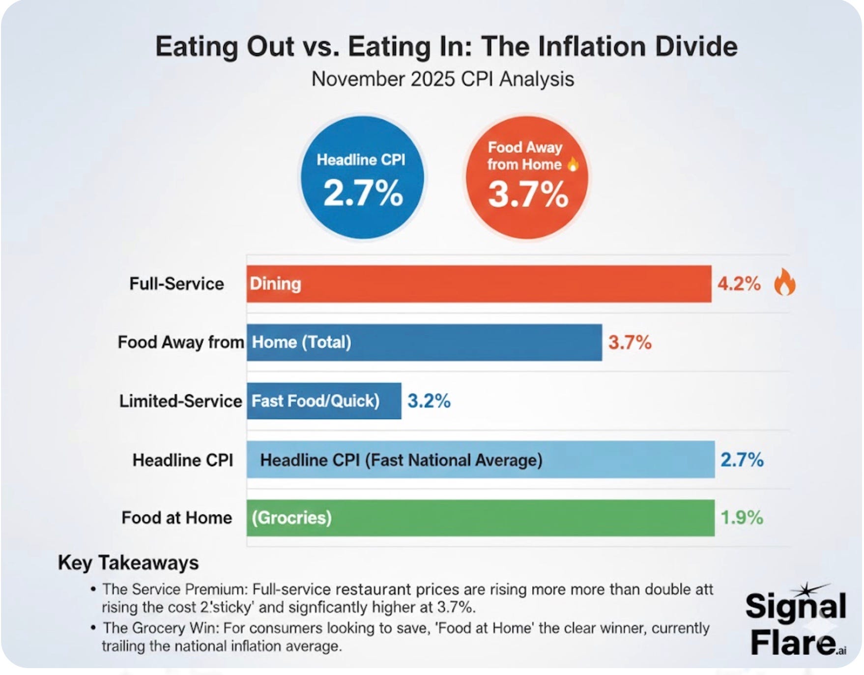 Category YoY Inflation Headline CPI 2.7% Food Away from Home 3.7% Full-Service Dining 4.2% Limited-Service (QSR) 3.2% Food at Home (Groceries) 1.9%